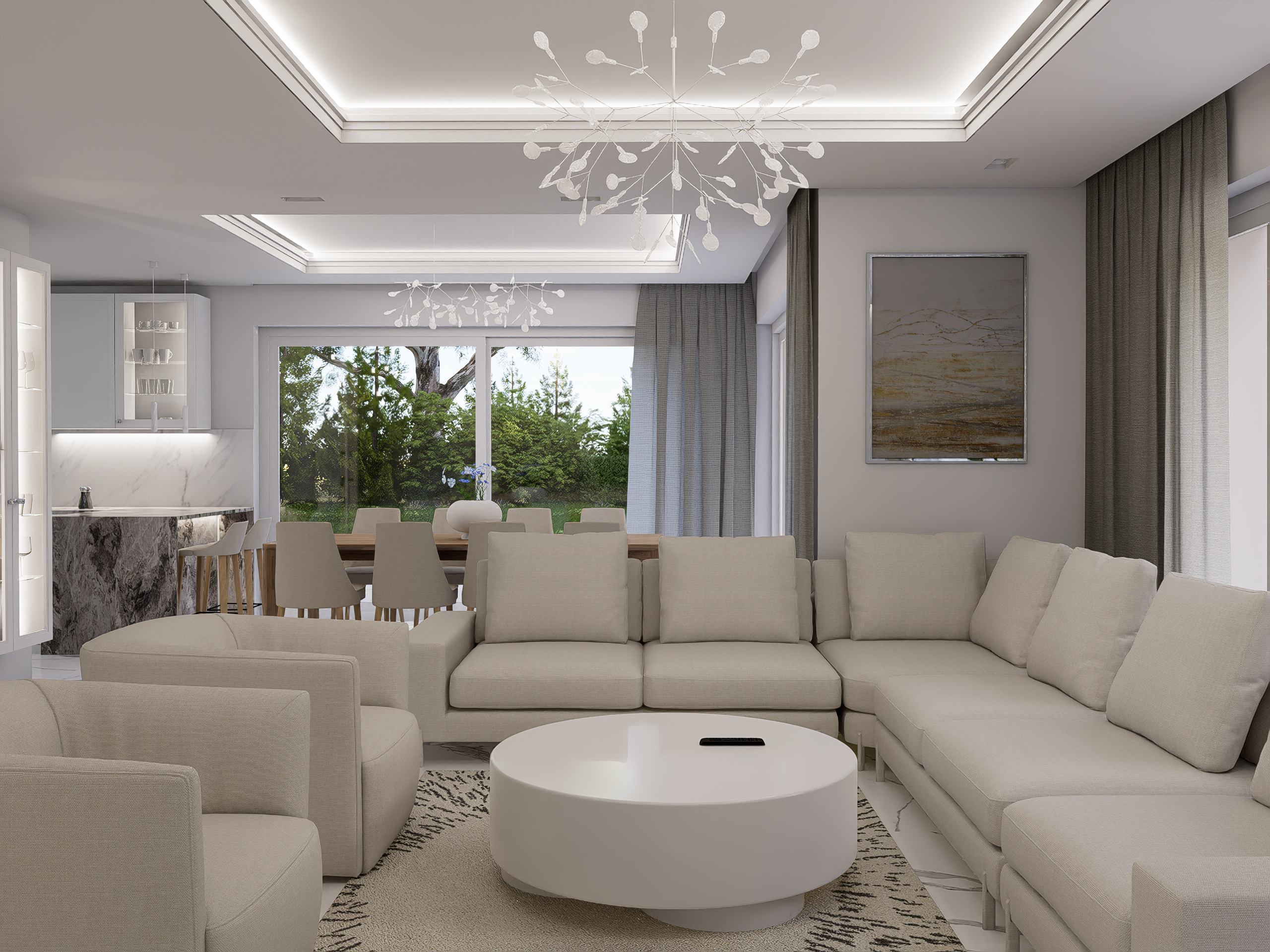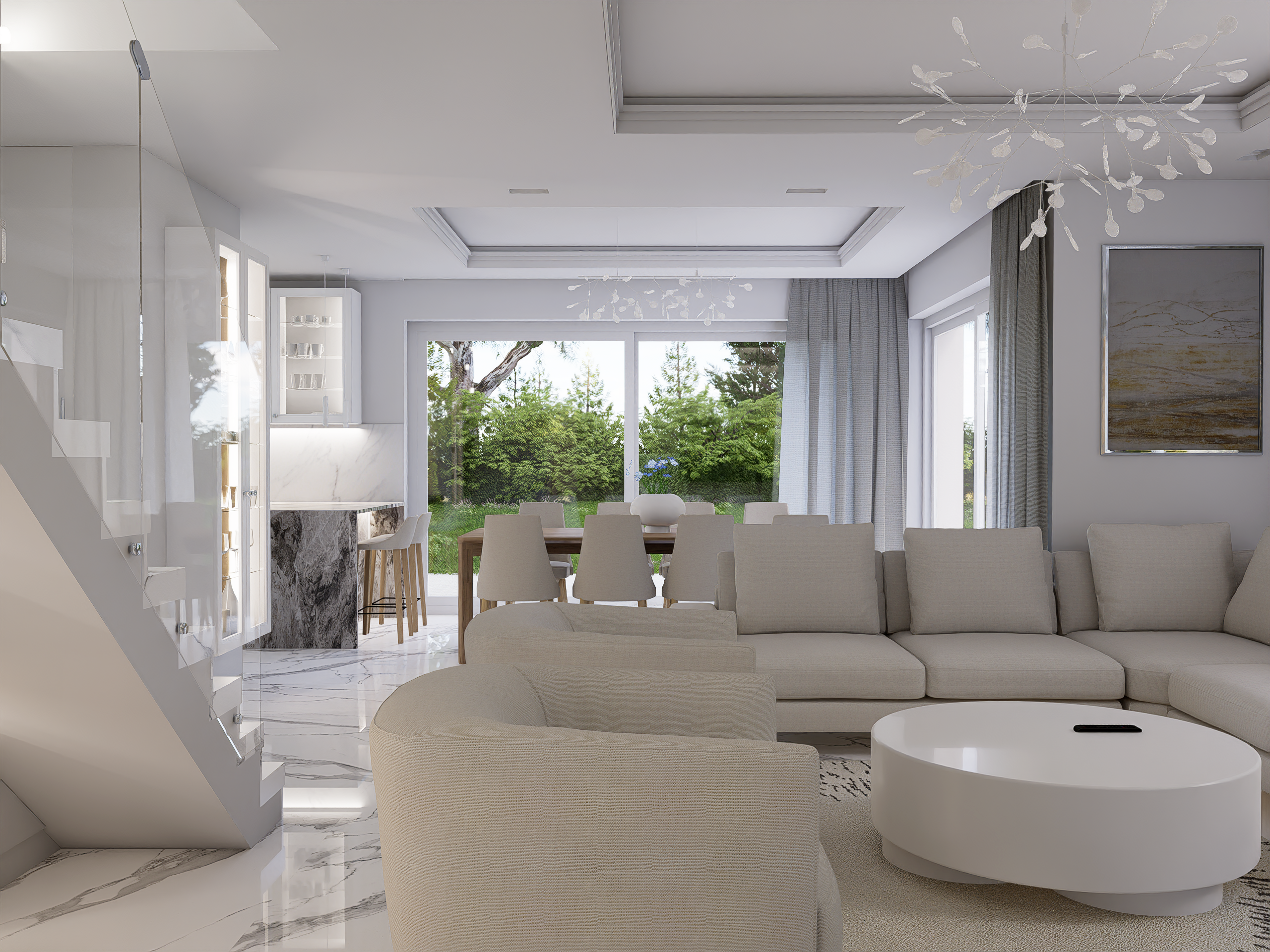 Salon, kuchnia i jadalnia w domu jednorodzinnym